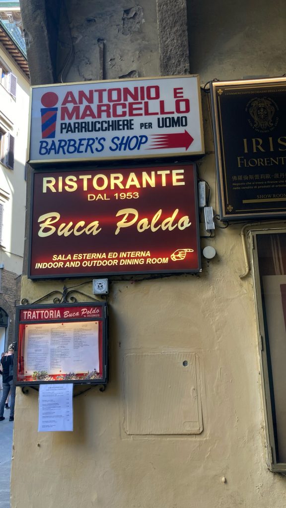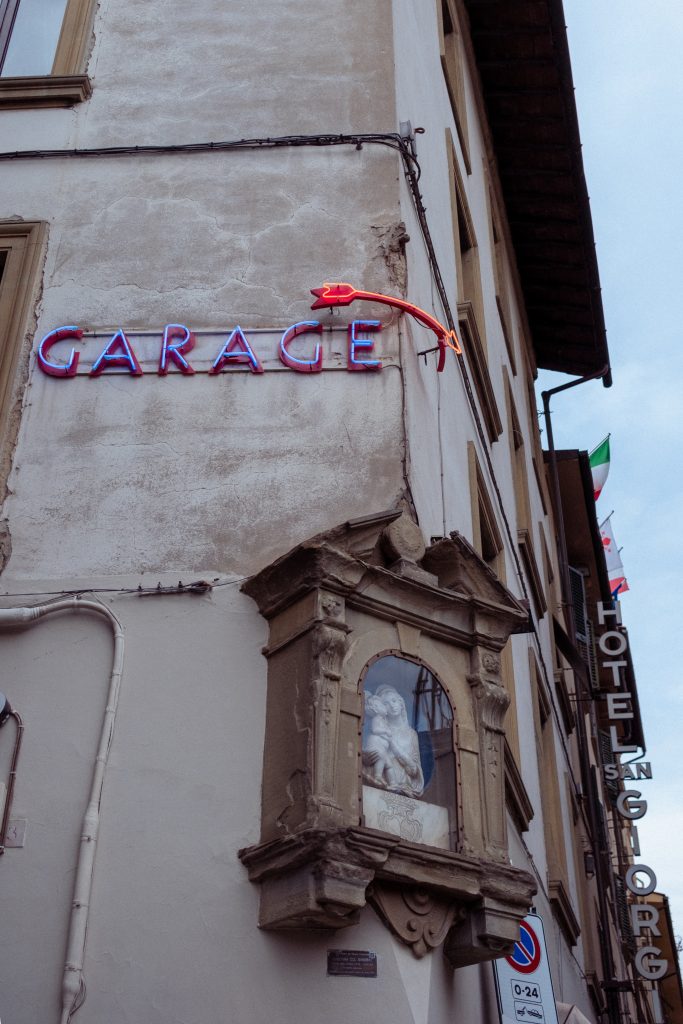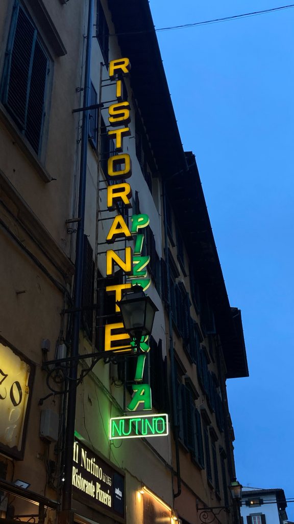 In der Kunsthauptstadt Italiens stachen mir als erstes die vielen altmodischen Werbe-Schriftzüge ins Auge, die in dieser, sowohl in der Gegenwart wie Vergangenheit, sehr touristischen Stadt wahrscheinlich die Aufmerksamkeit hungriger, durstiger oder müder Reisender auf sich ziehen sollten. Irrt man durch die wunderschönen historischen Gassen der Florentiner Innenstadt, könnte man meinen die Restaurants, Bars, Hotels und Herbergen befinden sich in einem stillen Duell um die Gunst der Touristen.