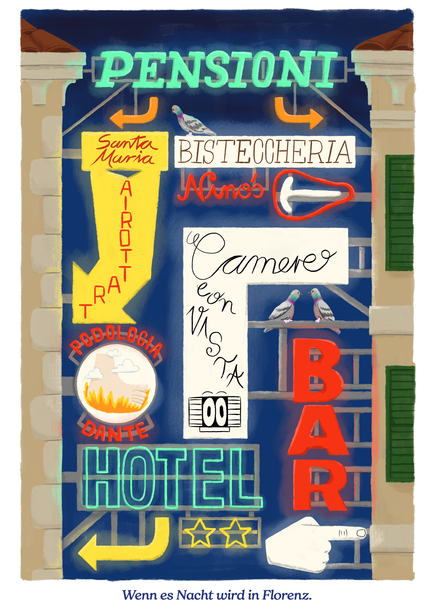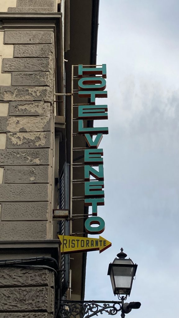 Altmodische Typografie ist auf Italienreisen immer ein Highlight für mich, in einer Vielzahl und einem Abwechlungsreichtum wie in Florenz, hatte ich sie vorher aber noch nie erlebt. Hier hat beinahe jedes Hotel, jedes Lokal und jede Dienstleistung einen Leuchtkasten oder ihren Namenszug in Neon an der Fassade angebracht. Die Magie entwickelt sich dann natürlich zur Abendzeit, wenn die Schriftzüge zu leuchten beginnen. Da können die Uffizien (zumal ohne eigenes Leuchtschild) einpacken…
