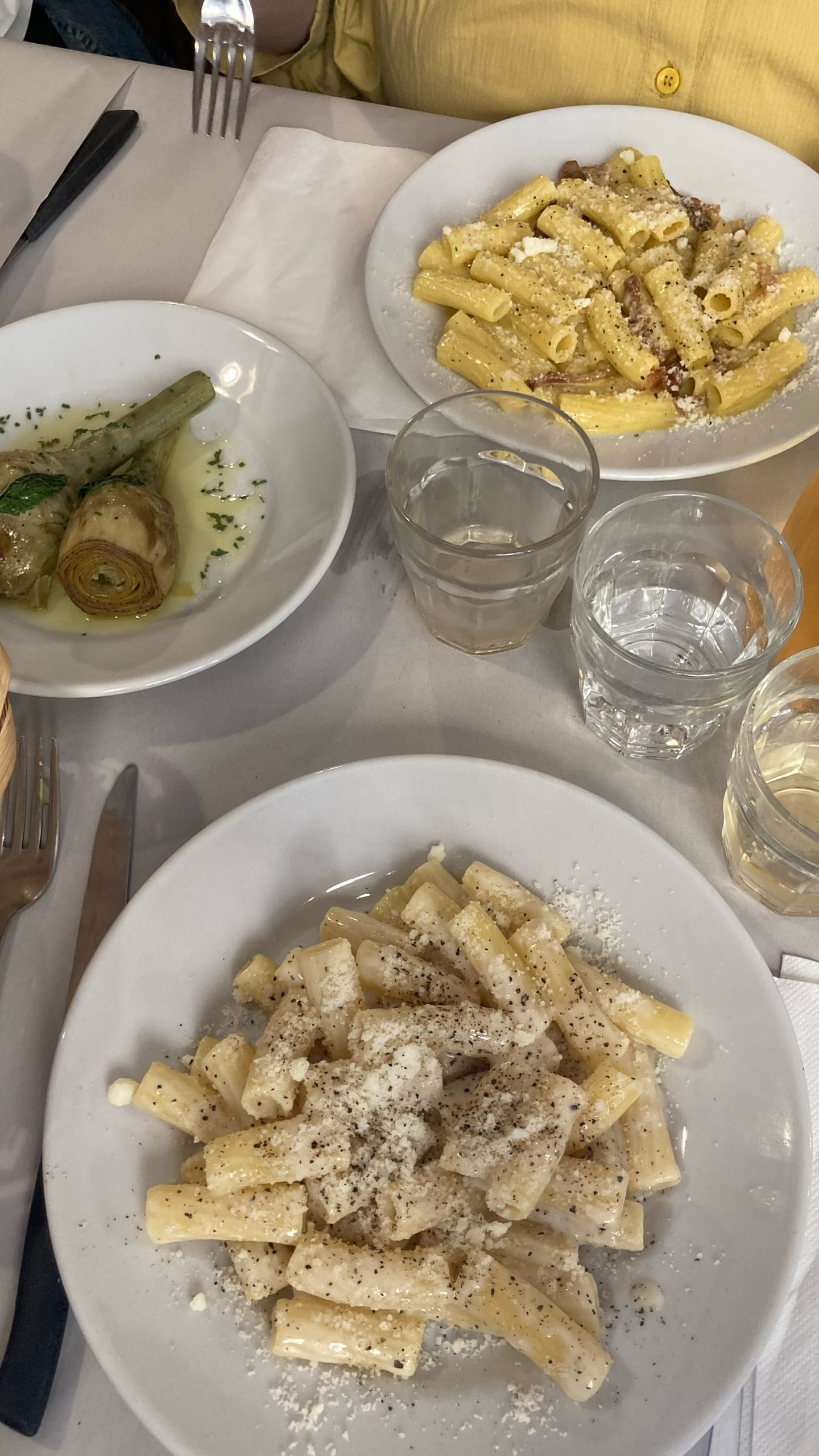 Über die ewige Stadt muss man nicht mehr viele Worte verlieren, deswegen bleibt mir nur zu sagen: In Rom lässt es sich gut essen. Das wiederum kann man zwar eigentlich von jeder italienischen Stadt sagen, aber welche andere Stadt kann schon die Carbonara für sich beanspruchen? In Rom isst es sich entweder besonders gut in altehrwürdigen Institutionen wie dem Ristorante Nino, nahe der spanischen Treppe oder dem La Matriciana, gegenüber der Oper oder aber in kleinen bodenständigeren Trattorien, die sich beinahe in jeder Gasse befinden. Egal wo, die Klassiker der römischen Küche, neben Carbonara und Cacio e Pepe, sind das die Amatriciana (Tomatensoße mit Guanciale), Puntarelle alla romana (ein bitterer Salat mit Sardellendressing) sowie die allgegenwärtige Artischocke, alla guidia (frittiert) oder alla romana (geschmort), sind ebenso ewig wie die Überbleibsel des römischen Reichs und, wie man so schön sagt, immer eine Reise wert.