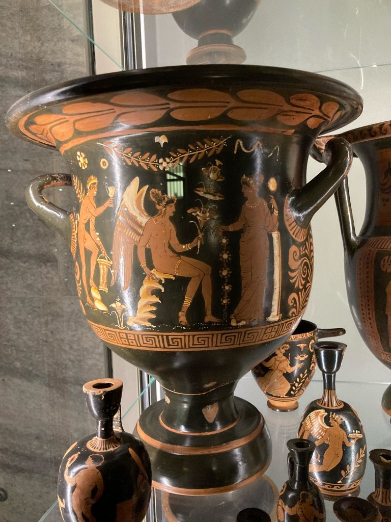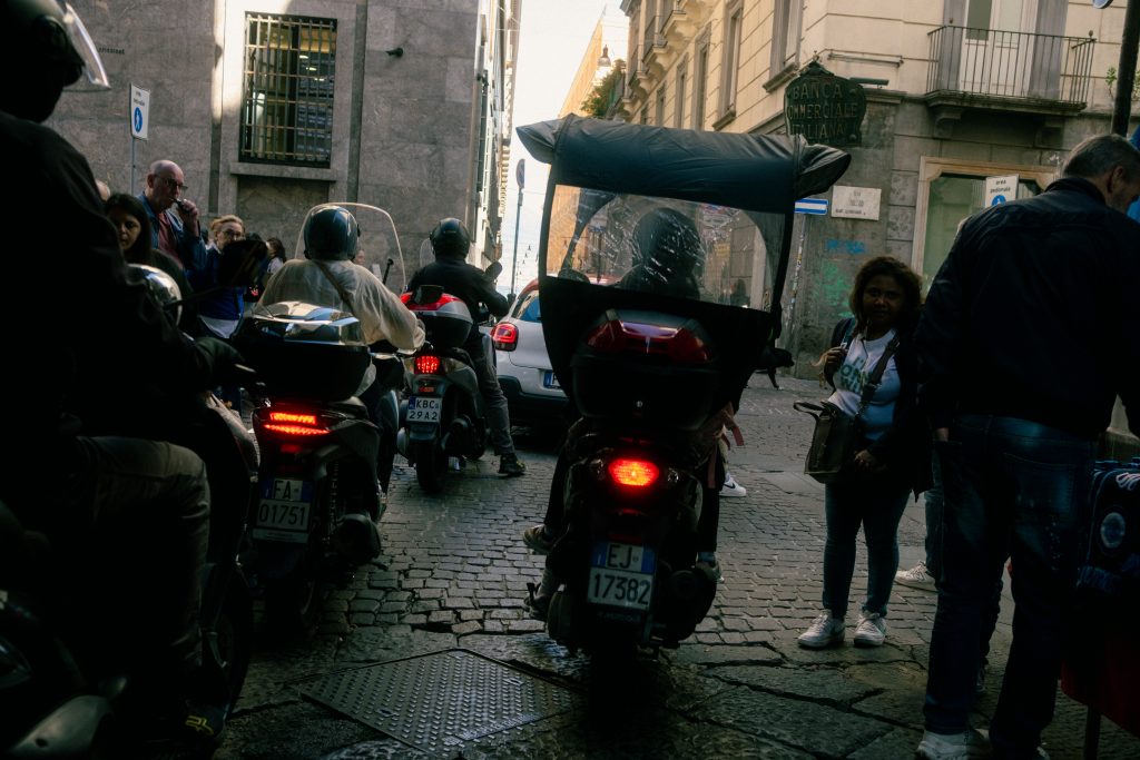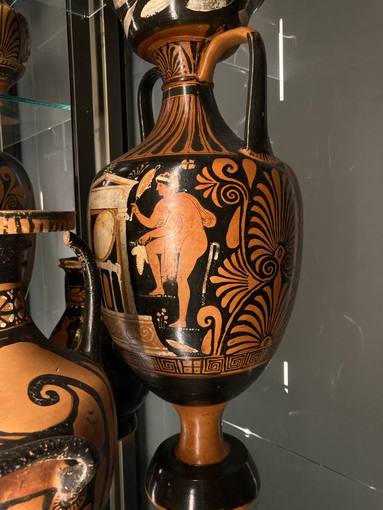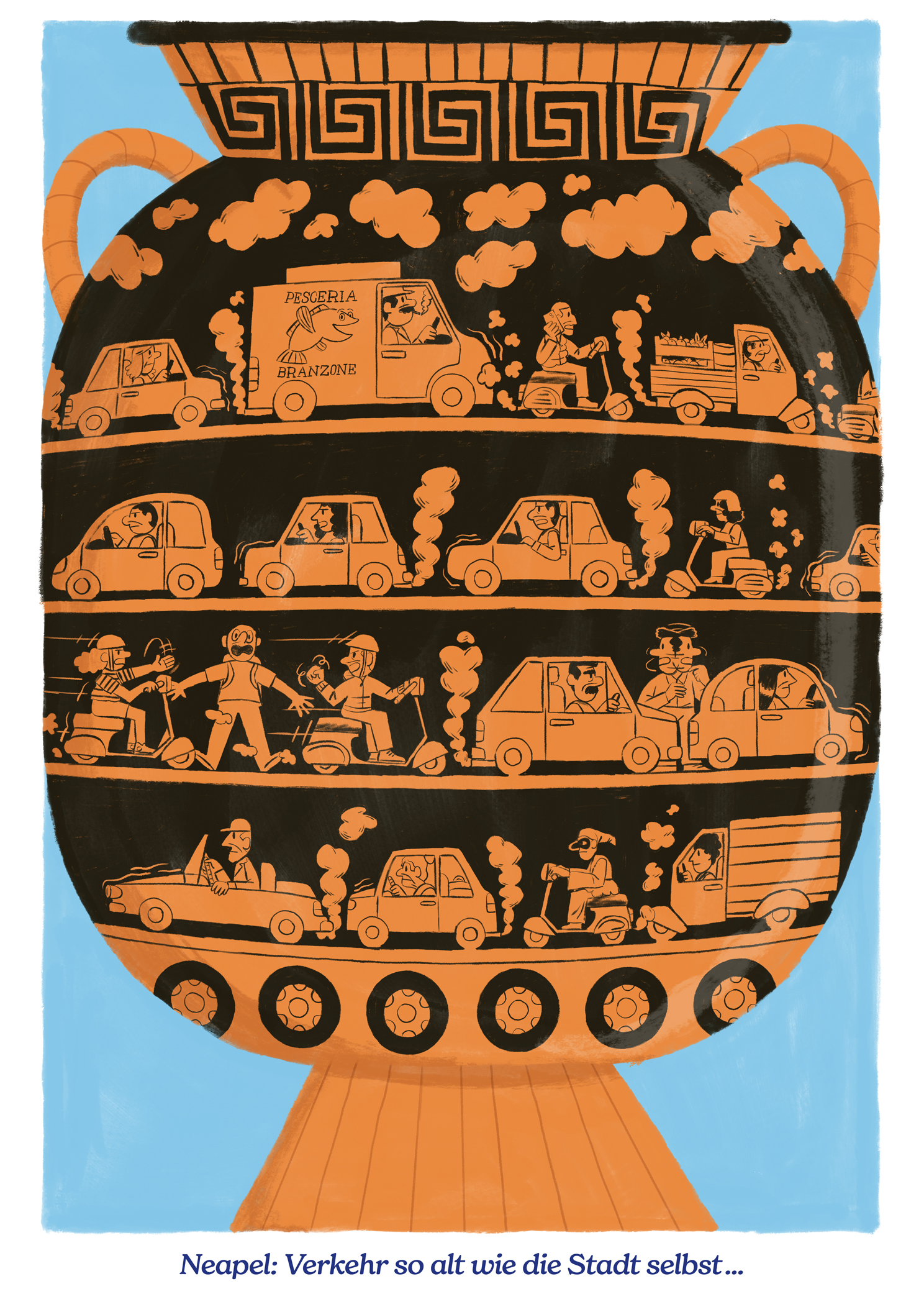 Natürlich ist einem der halsbrecherische Verkehr allgegenwärtig, eine genauere Idee, was damit anzufangen, kam jedoch erst beim spontanen Besuch der neapolitanischen Dependence der Gallerie d’Italia, einem Kunstmuseum, in das uns ein heftiger Regenschauer führte. Dort waren unter anderem einige griechische Vasen ausgestellt. Ob es sich hier um echte archäologische Fundstücke handelt, oder Nachbildungen aus dem 18. Jahrhundert, als der Stil der Antike mit der Entdeckung der nahe Neapel gelegenen Städte Pompeji und Herculaneum wieder sehr im Trend lag, ist mir nicht bekannt. In jedem Fall gefiel mir aber der Gedanke, den sehr grafischen Stil der in schwarz gehaltenen Zeichnungen auf dem braunen Tongrund als modernes neapolitanisches Motiv zu adaptieren.